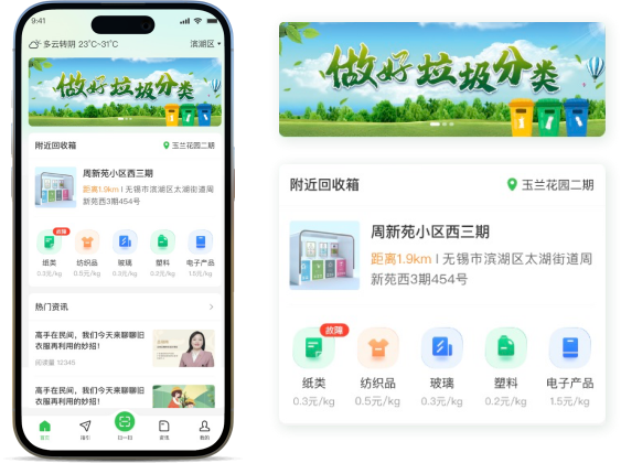 首页包含banner广告运营位置、附近的回收箱、回收类品价格、生活妙招、扫描开箱投递等功能
