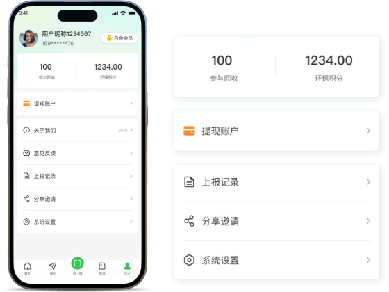 小黄鹏用户在“我的”中查看会员等级、历史订单、上报记录、支持环份积分提现,可分享邀请新用户注册加入